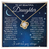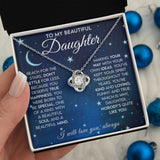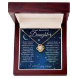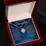 Accompanied by a heartfelt message card, the Love Knot Necklace carries a powerful sentiment for your daughter. The card reads: "To My Beautiful Daughter, Reach for the stars, don't settle for less. Because you deserve true happiness. You were born to be special, one of a kind. With a beautiful soul and a beautiful mind, making your way with your own ideas. You've kept your spirit throughout the years, you're kind and loving. Funny and true, which is why daughter, nobody's quite like you."