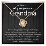 Accompanied by a heartfelt message card, the Love Knot Necklace is a beautiful tribute to Grandma's role in the family. The card reads: "To an awesome Grandma. Being a mother may be the most important job, but being a grandma is the most fun - so enjoy the ride! You are going to make a wonderful grandma!" This high-quality piece of jewelry, adorned with a brilliant pendant, captures Grandma's radiant spirit and love. Give Grandma a token of appreciation that she will treasure for years to come, symbolizing the love, gratitude, and joyous journey of grandparenthood.
