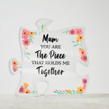 Crafted from high-quality acrylic, this plaque features a vibrant and eye-catching design with the words "Mum you are the piece that holds me together" prominently displayed in a beautiful and stylish font. The plaque is lightweight, durable, and easy to clean, ensuring that it will remain a cherished keepsake for years to come.