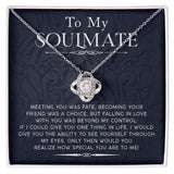 Accompanied by a heartfelt message card, the Love Knot Necklace speaks volumes of your feelings. The card reads: "To My Soulmate. Meeting you was fate. Becoming your friend was a choice. But falling in love with you was beyond my control. If I could give you one thing in life, I would give you the ability to see yourself through my eyes. Only then would you realize how special you are to me!" This extraordinary piece of jewelry, embellished with a brilliant pendant, reflects the depth of your affection. It is a heartfelt gift that will remind your soulmate of your irreplaceable connection and their unique significance in your life.