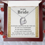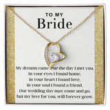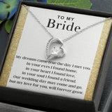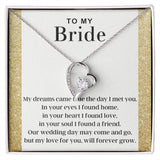 Presenting our Love Knot Necklace, a heartfelt gift for brides. This elegant accessory comes with a message card that reads: "To my Bride, My dreams came true the day I met you. In your eyes, I found home, in your heart, I found love. In your soul, I found a friend. Our wedding day may come and go, but my love for you will forever grow." Symbolizing eternal love, this necklace is a beautiful reminder of your unique bond. Show your bride how much she means to you with this cherished keepsake.